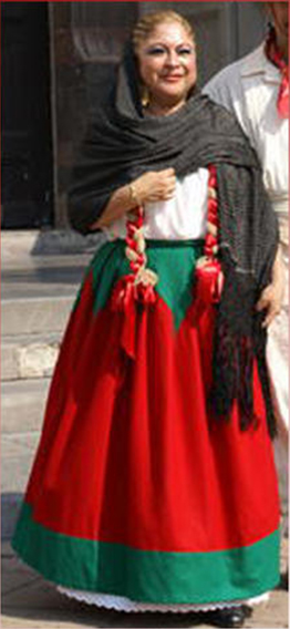 Este traje se compone de falda elaborada en manta llamada Zagalejo, colocando sobre esta, otra falda de franela en color rojo, sin bordados incluyendo triángulos verdes en la cintura, y a lo largo de bastilla.