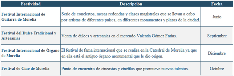3 Museos: Regional Michoacano, De Arte Colonial, Casa Natal de Morelos y Casa de las Artesanías. Mercados: De San Agustín, De los Dulces. Espacios abiertos: Plaza de Armas, Plaza Villalongin, Portal Aldama, Callejón del Romance, Calzada Fray San Antonio de San Miguel.