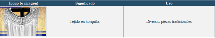Dentro de los tejidos existen: tejidos en horquilla y aplicaciones a gancho en hilo crochet de algodón, rejillados, bordados a mano en hilo de perlé de algodón.